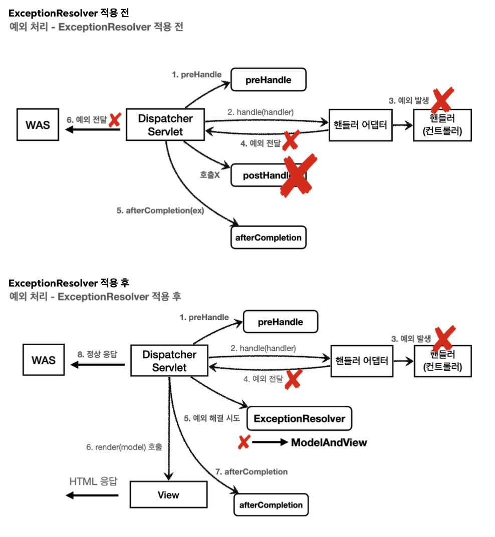 - ExceptionResolver로 예외를 해결해도 postHandle()은 호출되지 않음