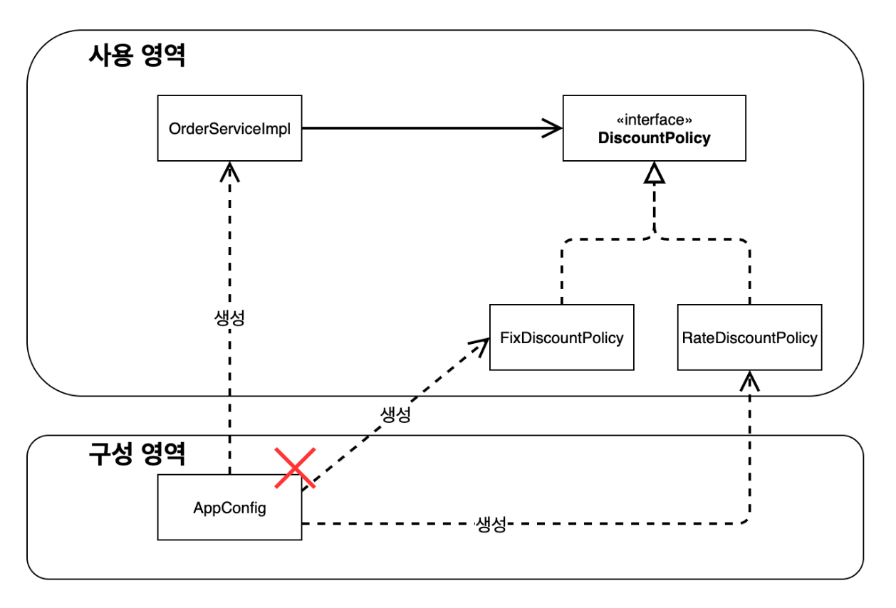 - AppConfig가 FixDiscountPolicy 객체 인스턴스를 클라이언트 코드 대신 생성해서 클라이언트 코드에 의존관계 주입