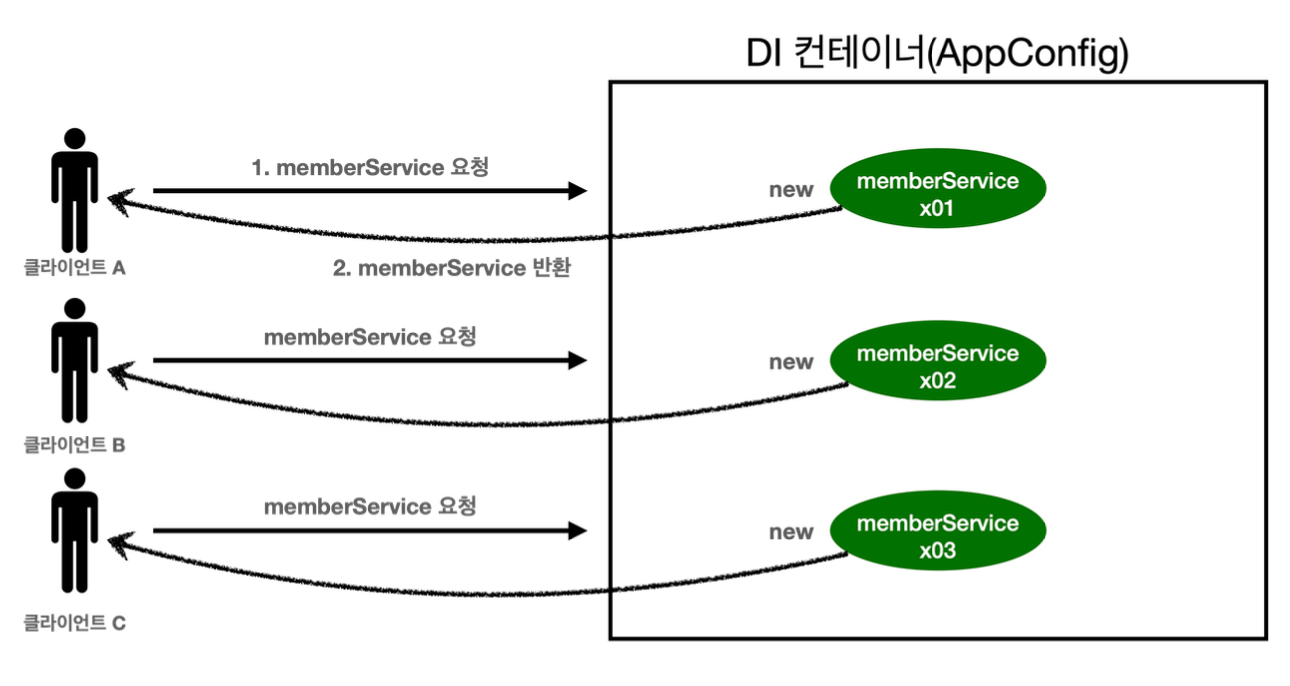 - 스프링 컨테이너는 싱글톤 패턴을 적용하지 않아도 객체 인스턴스를 싱글톤을 관리