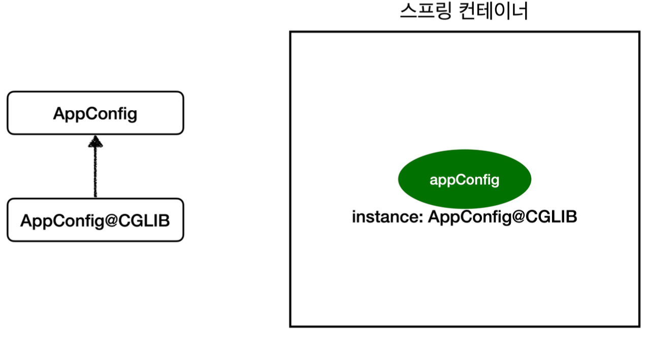 - 스프링이 CGLIP라는 바이트코드 조작 라이브러리를 사용해서 AppConfig 클래스를 상속받은 임의의 다른 클래스 생성