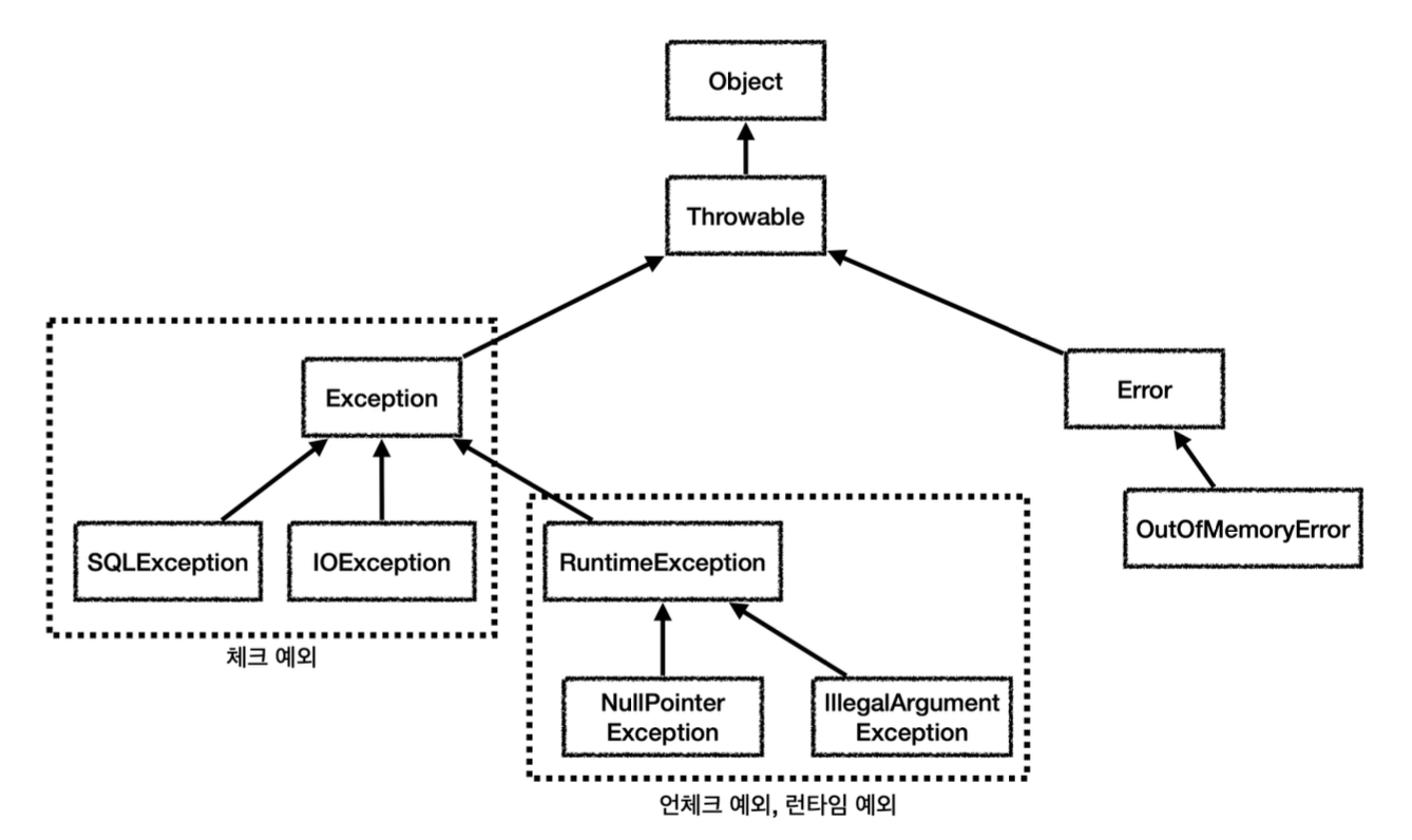 - Exception과 그 하위 예외(RuntimeException 제외)는 모두 컴파일러가 체크하는 체크 예외