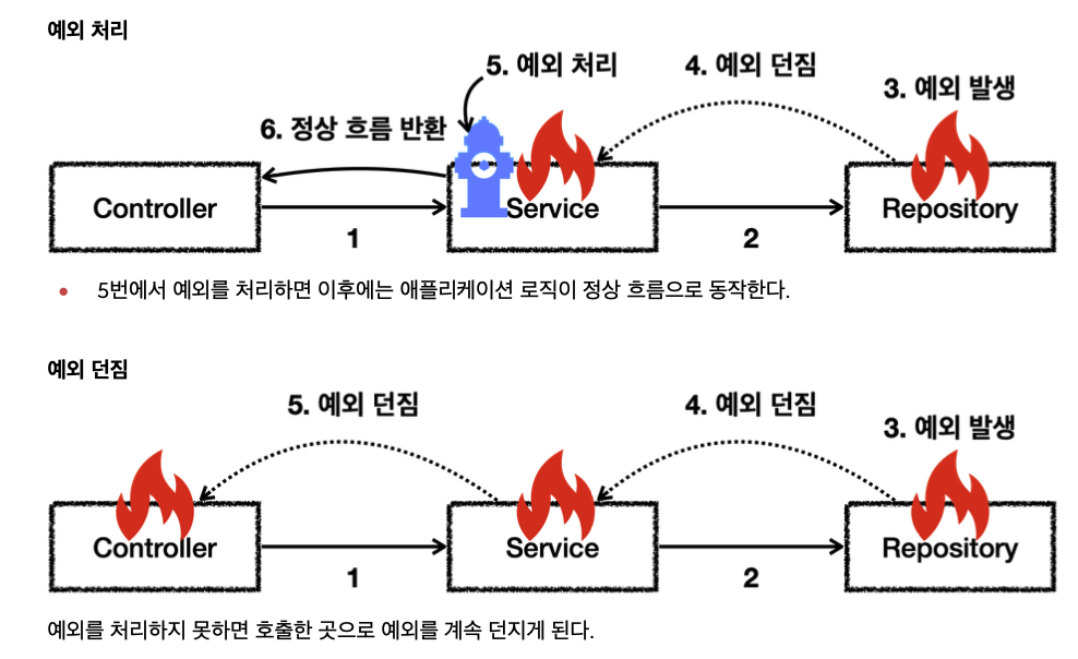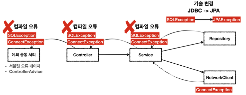 - 구현 기술이 변경되는 경우, 예외를 공통으로 처리하는 곳에서 예외에 따른 다른 처리가 필요할 수 있음