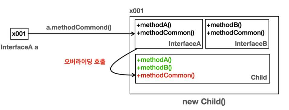 - 결과적으로 두 부모 중 어떤 부모의 methodCommon()을 선택하는 것이 아닌 자신이 구현한 methodCommon()을 사용