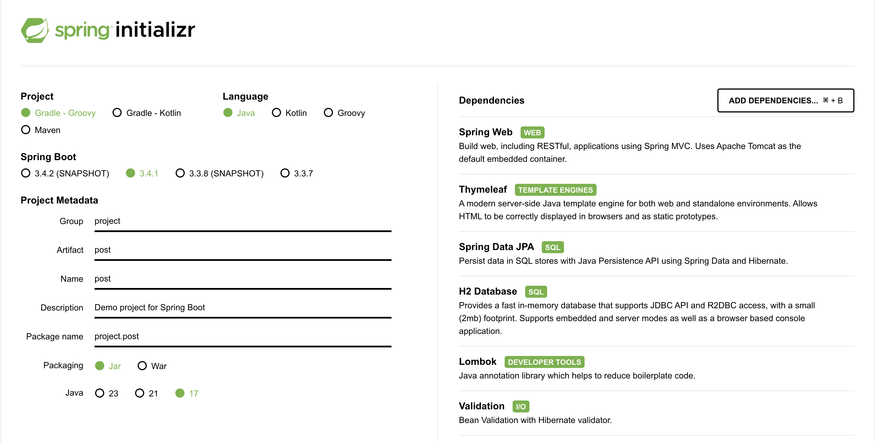 - Thymeleaf : Thymeleaf 템플릿 엔진을 사용하여 View를 렌더링 하기 위한 의존성을 제공