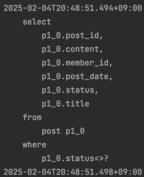 게시글 목록을 조회할 때, 데이터는 정상적으로 출력되었으나 로그 상 쿼리를 보면 2번 실행되고 있는것을 확인할 수 있다. 게시글 목록을 조회하고(1번), SELECT 결과의 Member가 존재하기에 연관된 Member를 또 조회한다(2번). N+1문제가 발생하였으며, 복잡한 연관관계의 경우 여러번 실행되어 성능 저하를 일으킬 수 있다고 생각하였다. 그래서 지연로딩을 적용하였다.