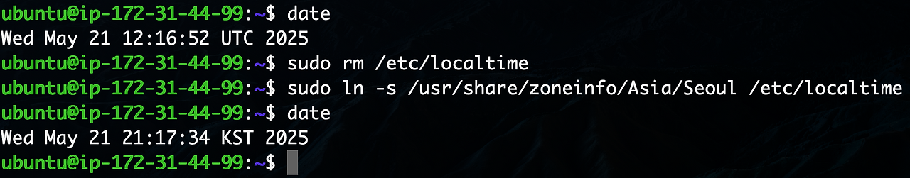 - date 명령어를 통해 타임존 변경 전/후를 비교하여 잘 적용된 것을 확인한다.