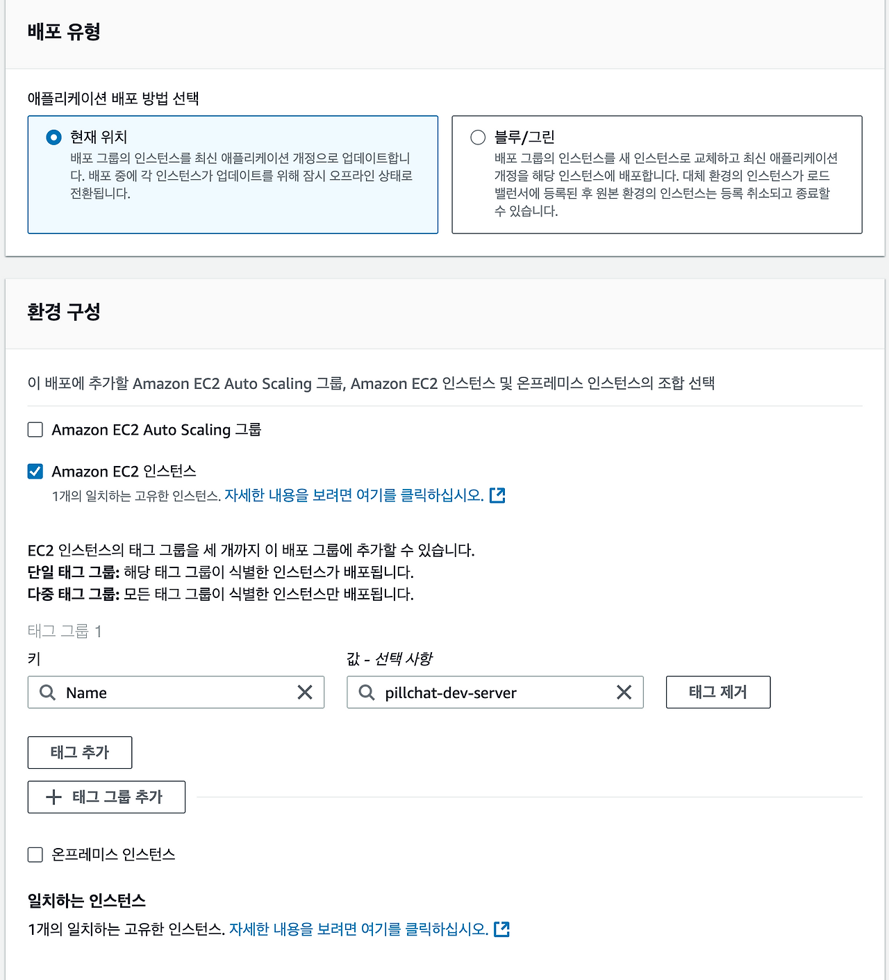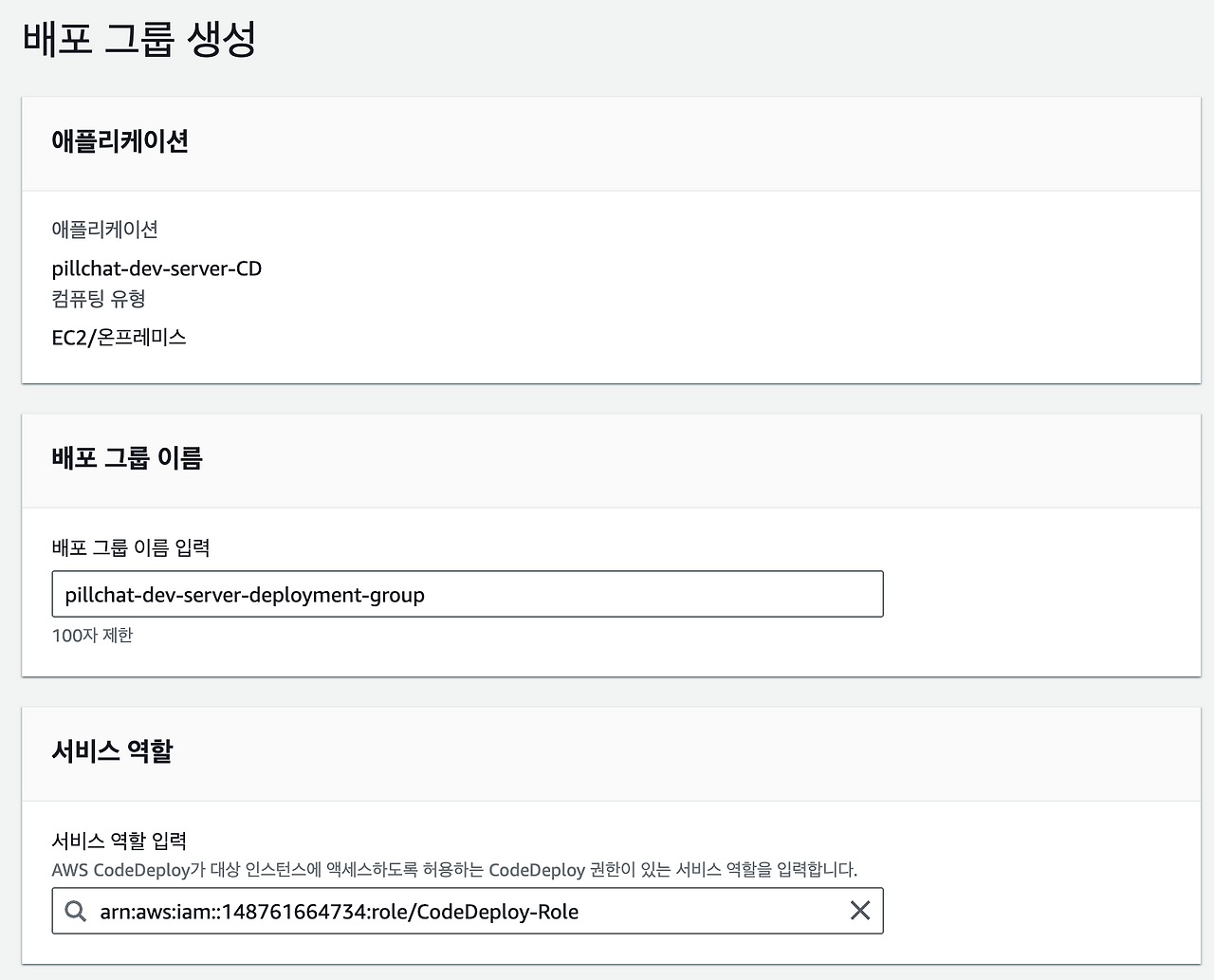- 배포 그룹 이름을 작성하고, CodeDeploy 용 역할을 선택한다.