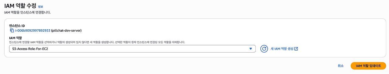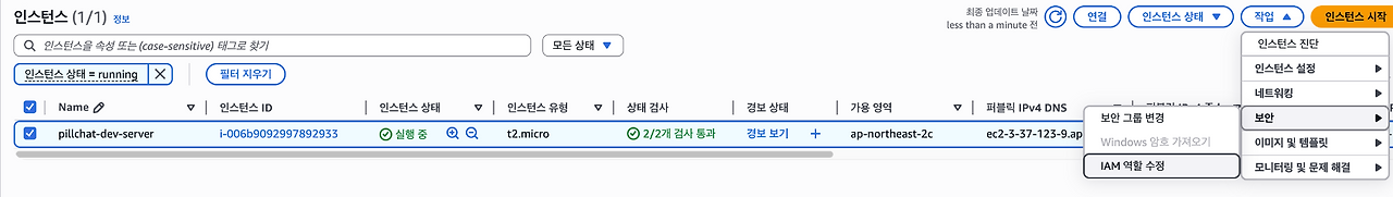 - EC2 대시보드에서 사용중인 인스턴스를 선택한 후 작업 - 보안 - IAM 역할 수정을 통해 위에서 생성한 S3용 역할을 부여한다.