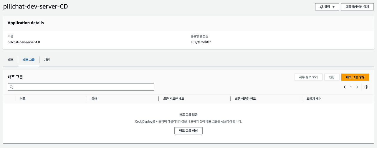 - 생성된 애플리케이션을 선택한 후 배포 그룹 생성을 클릭한다.