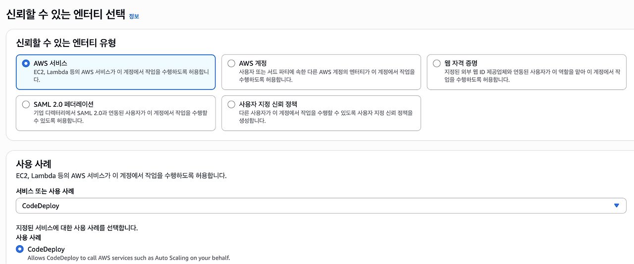 - IAM - 사용자 - 역할 - 역할생성을 통해 CodeDeploy용 역할을 생성한다.