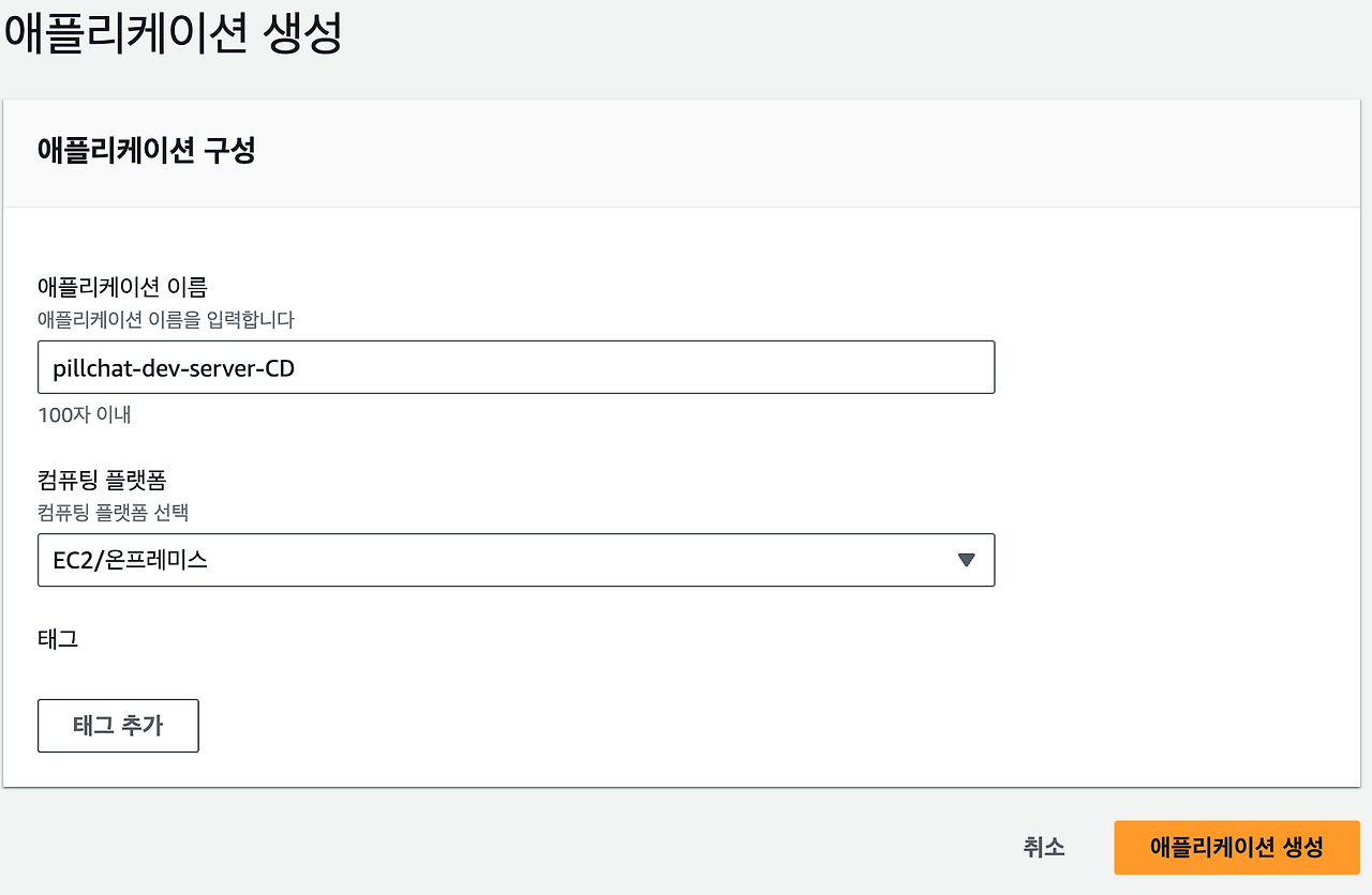 - CodeDeploy를 검색하여 애플리케이션을 선택 후 애플리케이션 생성을 생성한다.